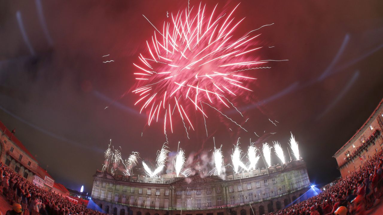 GRAF8660. SANTIAGO DE COMPOSTELA, 24/07/2019.- La plaza del Obradoiro abarrotada durante el espectáculo de luz y sonido de los fuegos del Apóstol 2019, víspera del Día de Galicia, esta noche en Santiago de Compostela. EFE/Lavandeira jr